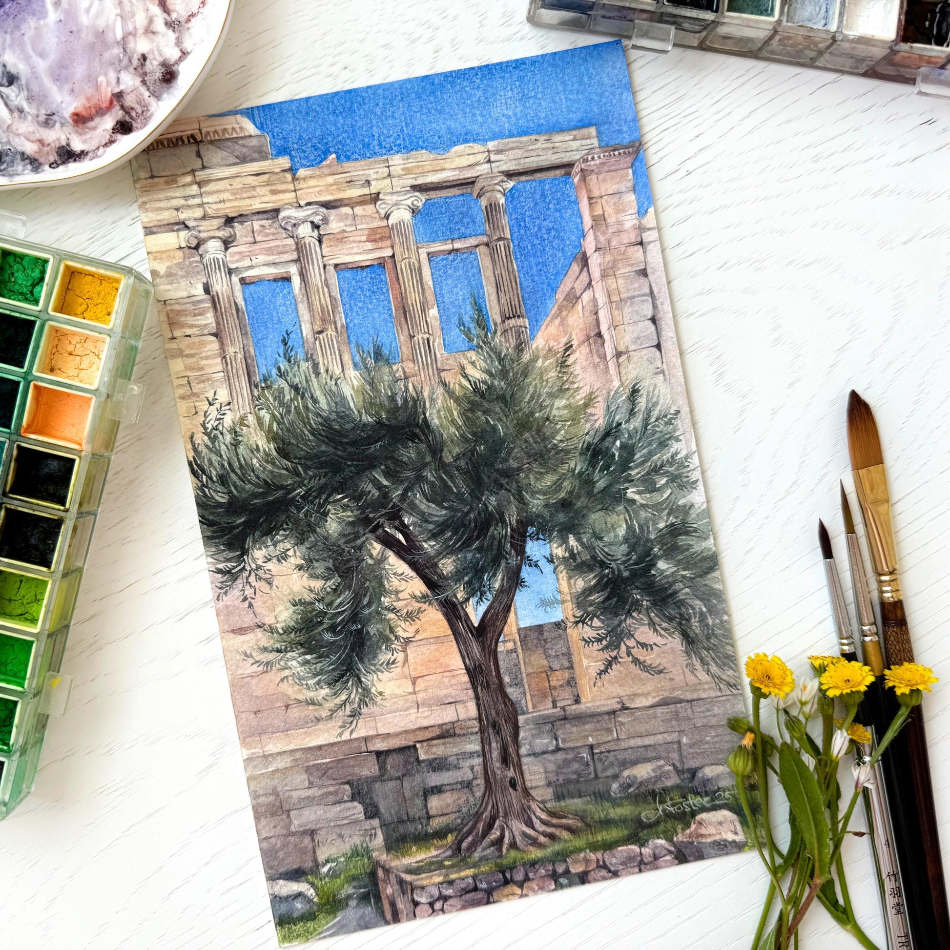Standing near this olive tree at the Parthenon, I felt the weight of history and was inspired to capture this magical place. According to legend, this very spot was where Athena, the goddess of wisdom, planted the first olive tree as a gift to the people of Athens. She struck the earth with her spear, and from it grew the sacred tree - a symbol of peace, prosperity, and resilience. Walking through the Acropolis, I couldn’t help but think that this is where art, as we know it, began.