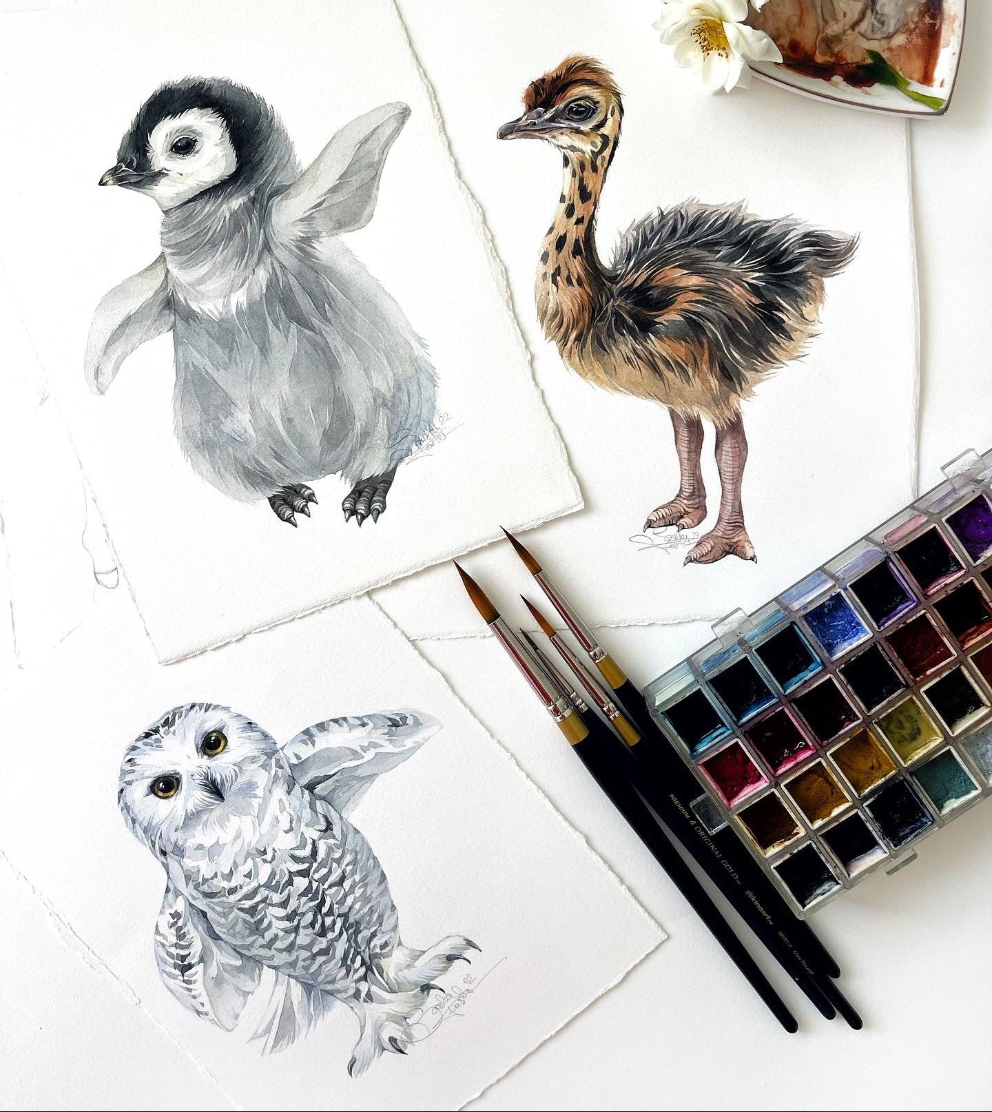Baby Snowy Owl - Original hand painted watercolor made on 100% cotton hot-pressed watercolor paper with professional vibrant watercolor paints