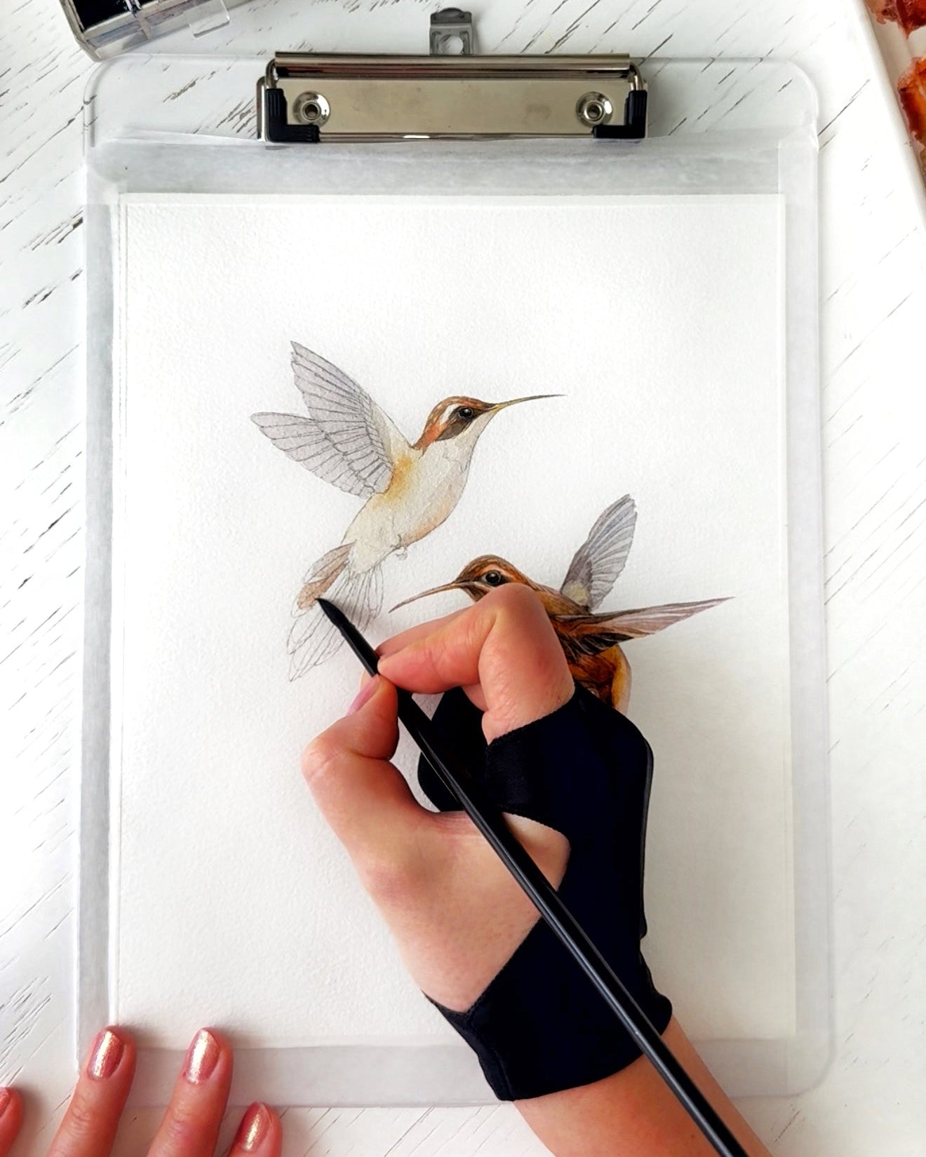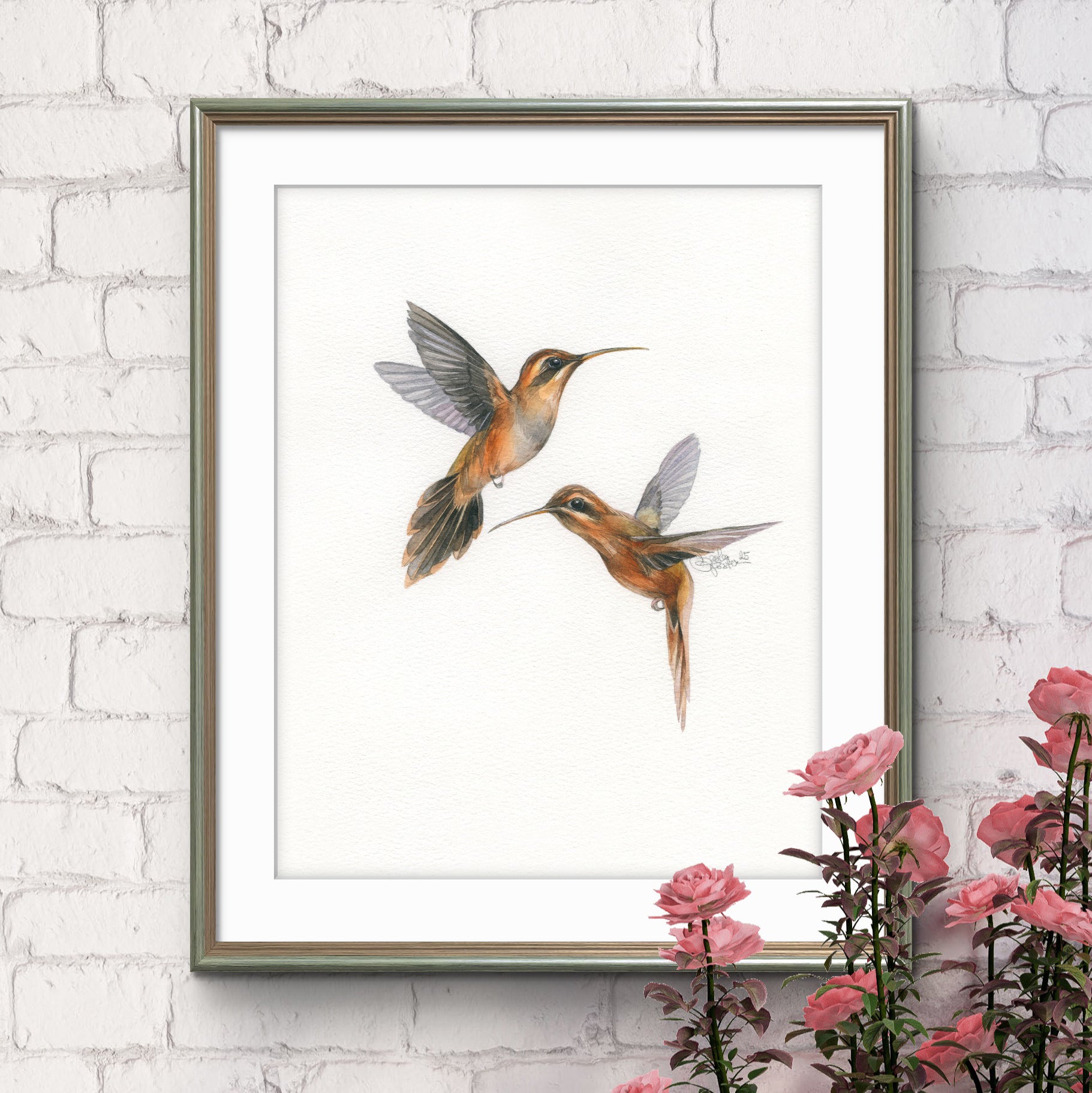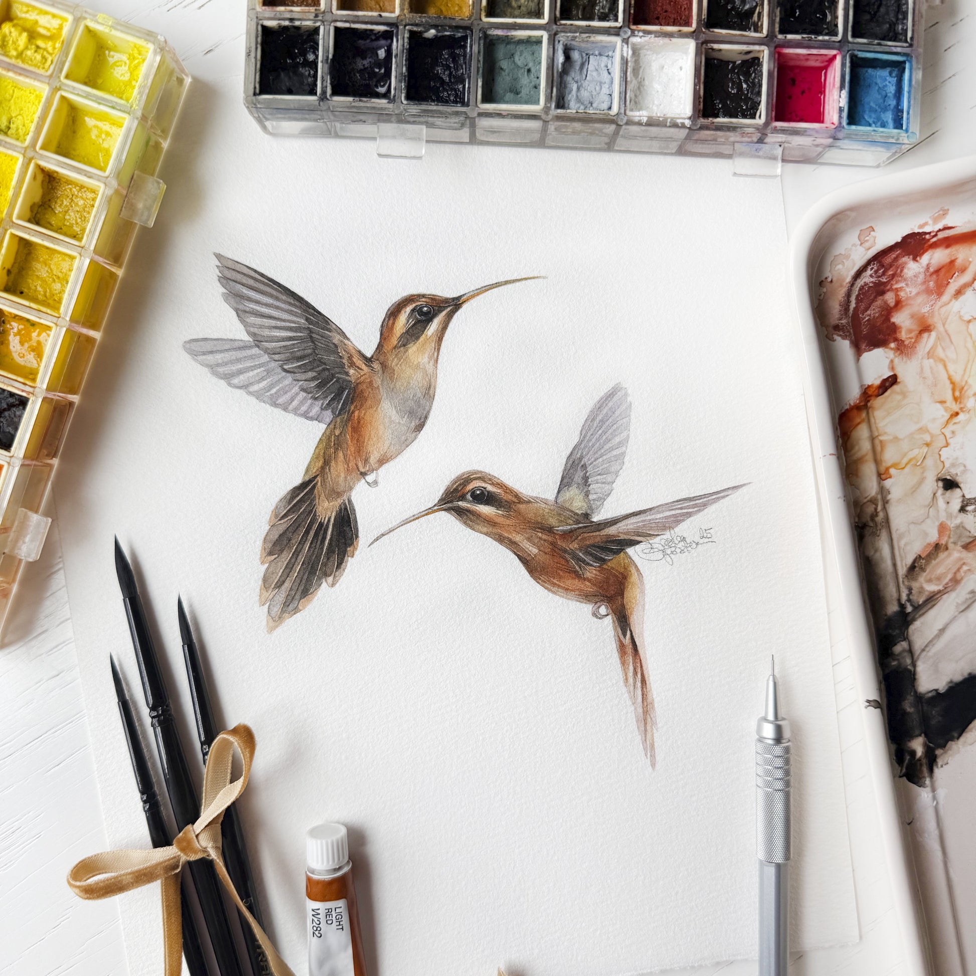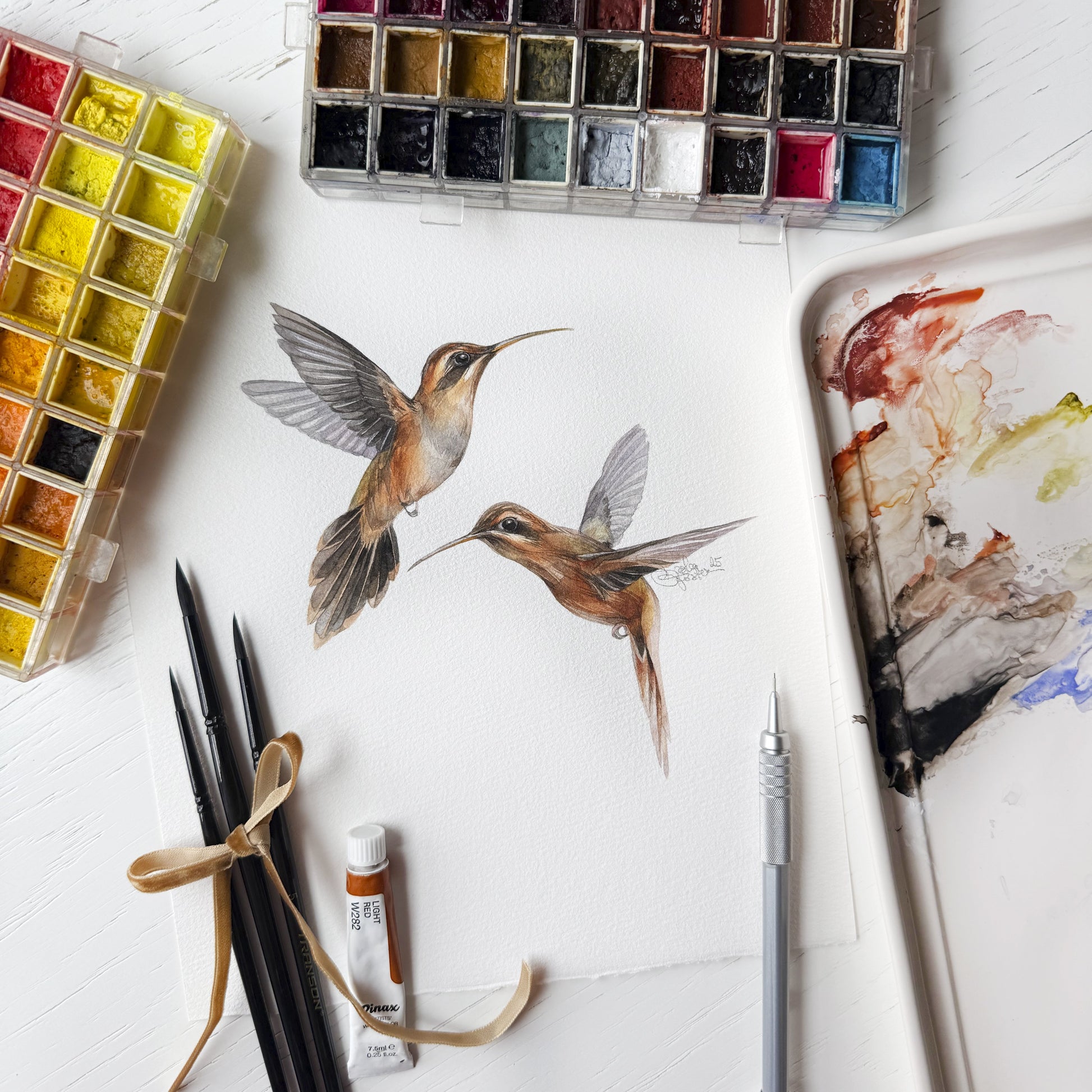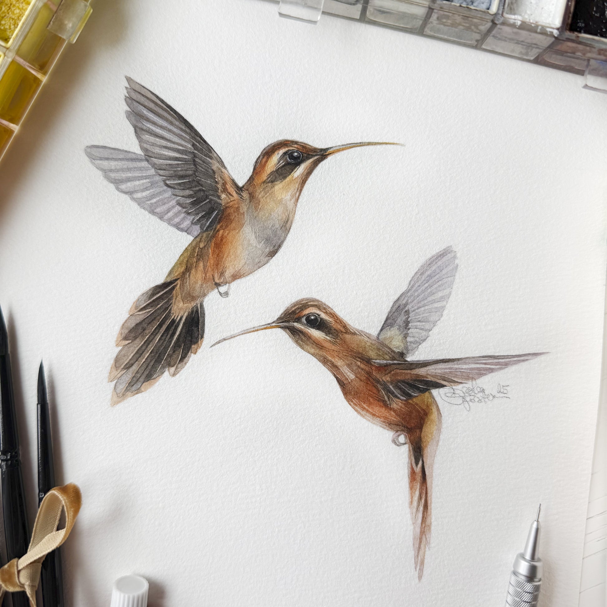 A quiet rainforest moment with two Stripe-throated Hermit hummingbirds, inspired by nature and painted with softness and care.